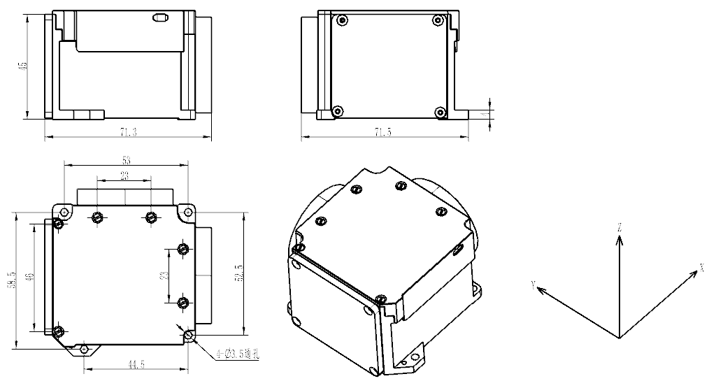 安装尺寸为:58.5mm*53.0mm*52.5mm*44.5mm±0.1mm,孔位4*Ф3.5;