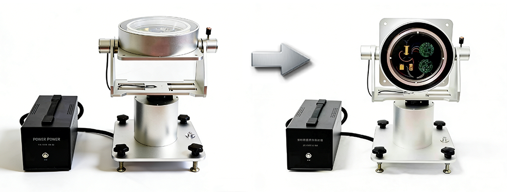 光纤陀螺教学实验系统主要用于光纤陀螺原理的实验和演示,光纤陀螺放置于一个专用的两轴转台上,设计有专用的控制箱,结合测控计算机可以完成相关的实验内容。光纤陀螺的外壳盖板采用高透明度亚克力材料,超辐射光源、光纤耦合器、光电探测器、光相位调节器、光路(光纤环)等部件及其连接结构清晰可见,通过声光显示指示对应名称和功能,也可以显示工作过程;可显示光纤陀螺Sagnac干涉仪输出变化,结合转台可以完成光纤陀螺仪寻北实验。