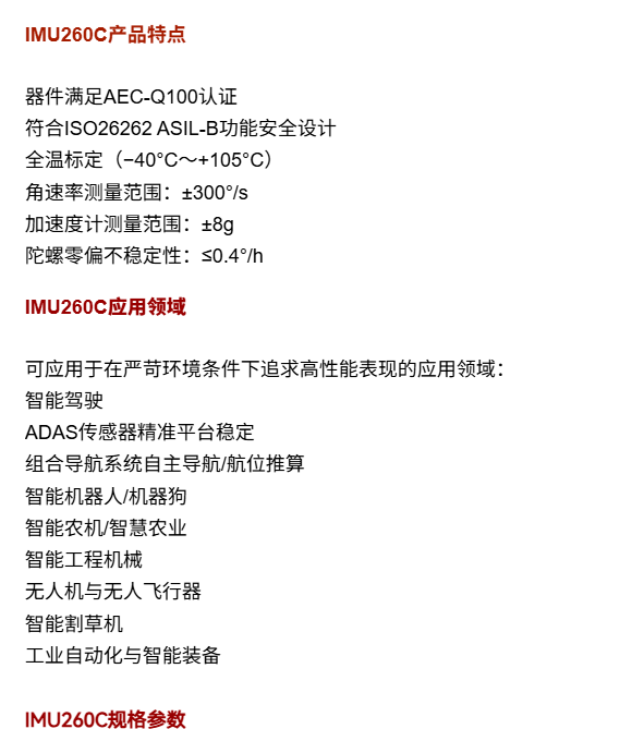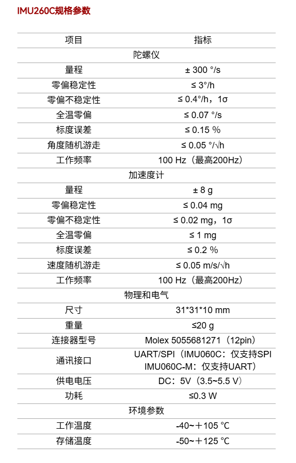 IMU260C-M 集成内置 MCU,可直接输出经标定补偿的 6DOF 惯性测量数据,实现传感器误差修正与数据解算的一体化功能。